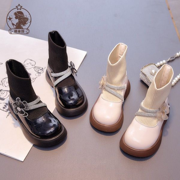 萌米莎新款加绒公主袜靴软底真皮马丁靴